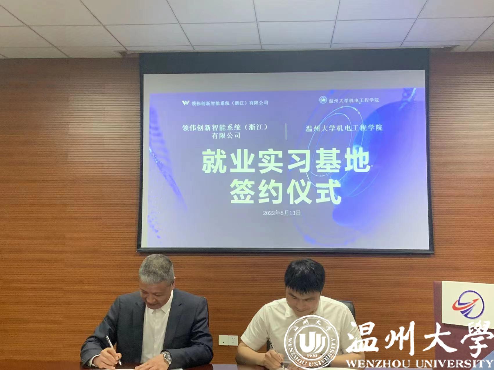 周荣书记、李小刚董事长代表校企双方签订就业实习合作协议,周荣书记向领伟创新智能系统(浙江)有限公司授牌,正式在该公司建设“追新番 就业实习基地”。