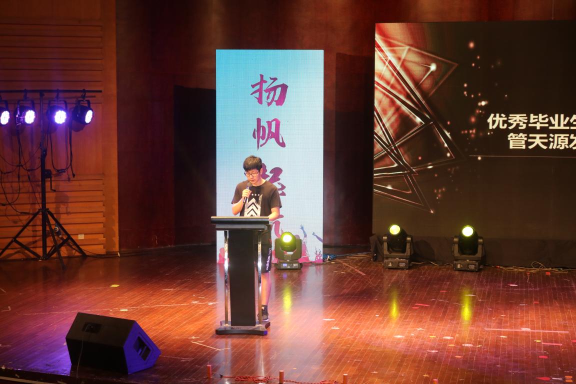 此次晚会由礼仪队热烈的开场舞《daddy》拉开帷幕。首先发言的是周宏明院长,他表达了对学院毕业生殷切的盼望和美好的祝福。接着,优秀毕业生代表14卓工一班管天源的发言表达了对于过往四年的怀恋以及对于未来的希望和对母校的感谢。在管天源同学发完言后,毕业班代表们为班主任献上了一束束鲜花。随后,黄沈权老师作为毕业班班主任代表发言。他的话语中饱含着对于学生的留恋和祝福,诚挚的希望他们日后能成就一番事业。在同学们和老师们发言过后,主持人宣布了一系列获奖名单,由周宏明院长、周荣书记等学院领导为获奖学生颁奖。