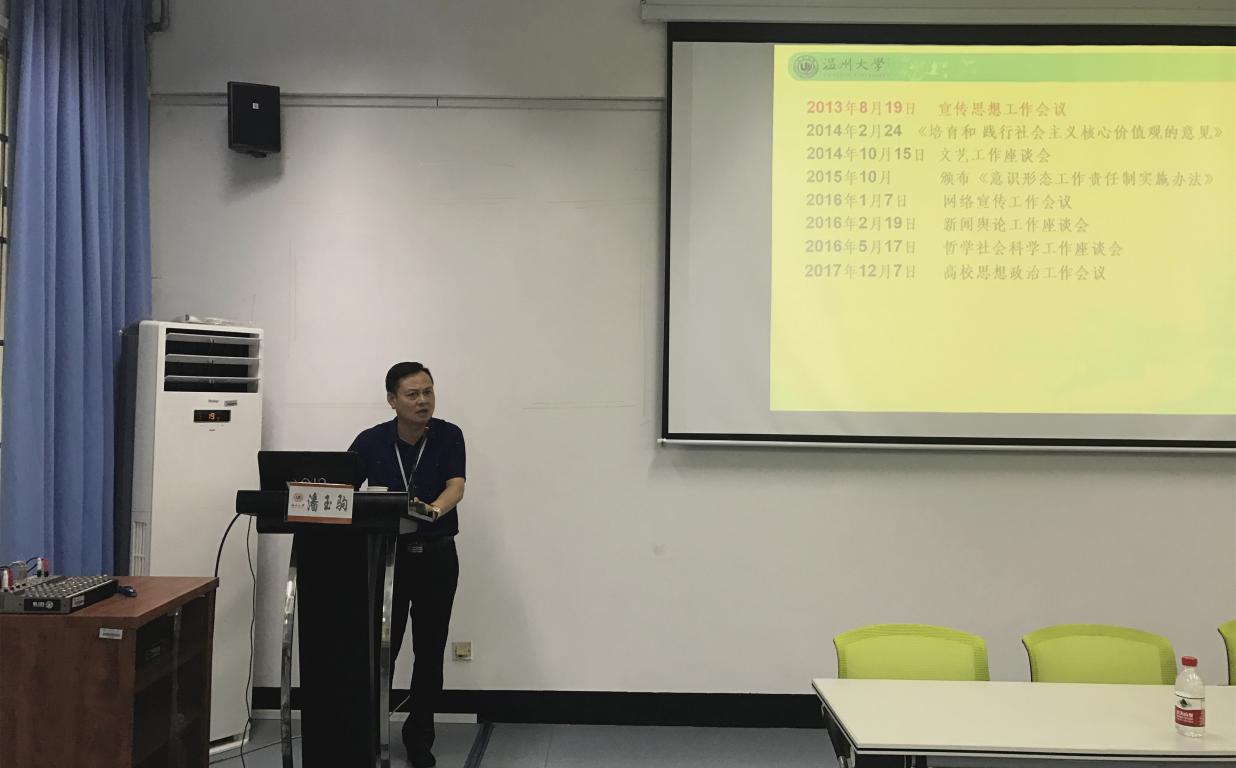 2018年6月20日下午,追新番 召开教师理论学习会,邀请学校党委委员、党委宣传部部长潘玉驹作题为《牢牢把握意识形态领导权主动权》的主题报告。学院教职工参加了学习会,党总支书记周荣主持。