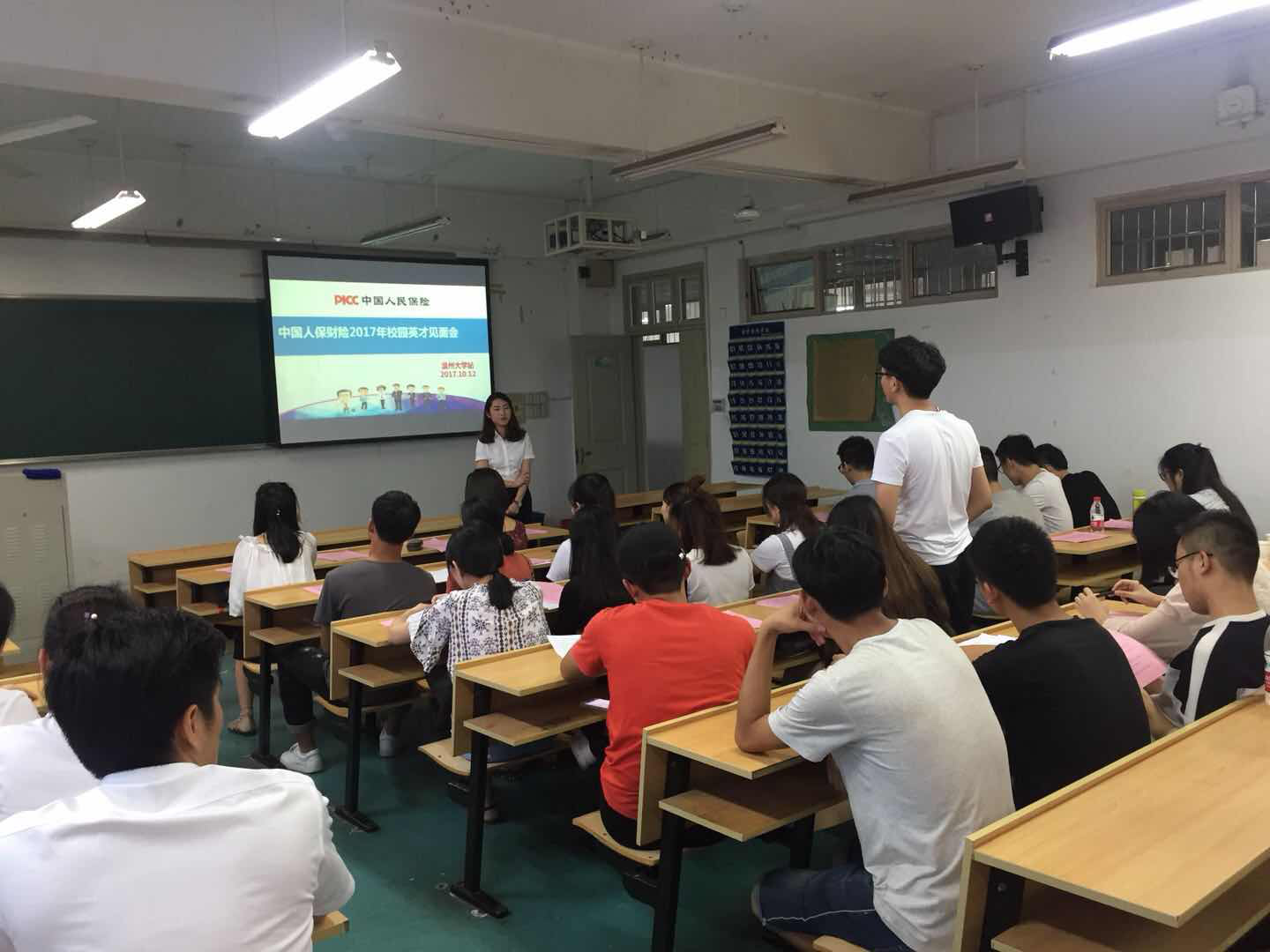 2017年10月12日下午,中国人保财险温州市分公司在我校追新番 6B-303举办“正青春·一起拼”为主题的校园宣讲会。宣讲会由中国人保财险温州市分公司人力资源部高玉琼女士主持,中国人保财险温州市分公司人力资源部经理助理宫翰,商业非车险部余坚凯、史流芳、叶静及汽车教研室储军博士出席,到会学生主要为追新番 汽车服务工程14级学生。
