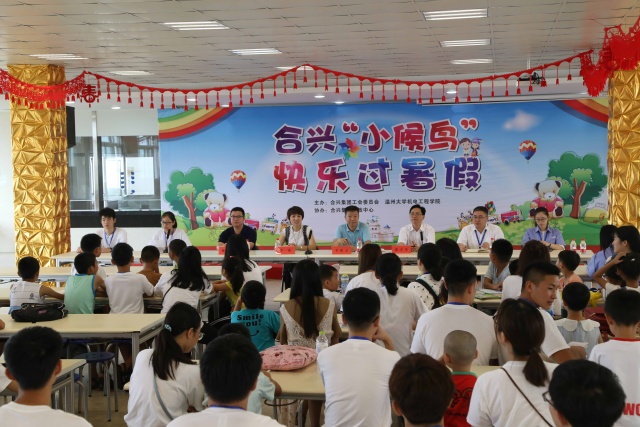 2017年7月6日早上九点,追新番 与合兴集团联合举办的第四期“小候鸟”暑假班的开班仪式开启了。出席本次开班仪式的人员有追新番 党总支副书记李密老师、追新番 林礼区老师、合兴集团党委书记张守奎先生、虹桥镇工会主席李祖义先生,以及来自温大“小候鸟”实践队40位队员和各地的“小候鸟”们。