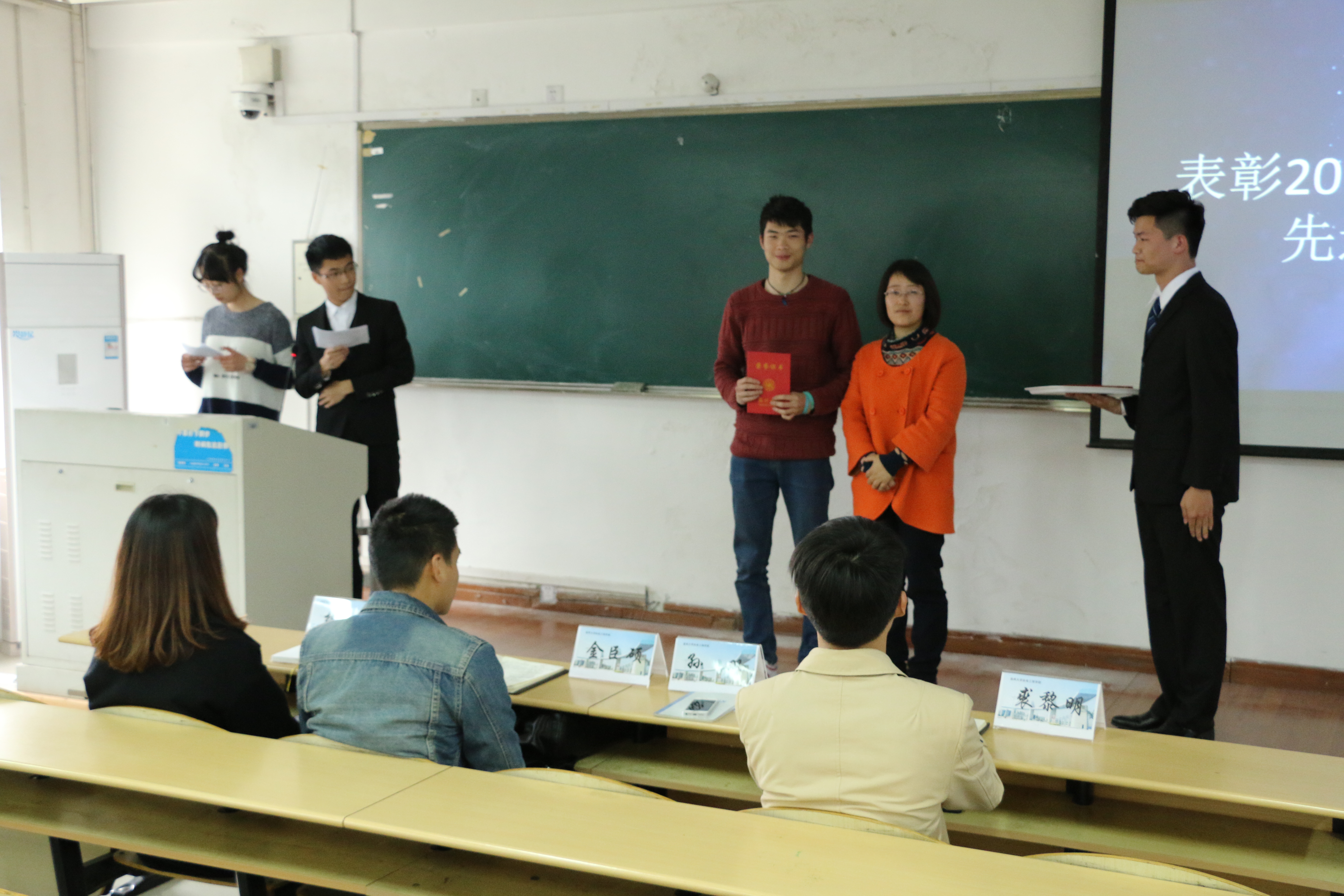 大会第二项,主持人播放了2016年追新番 暑期社会实践视频,在里面我们见到了2016年学校各实践队的实践活动照片,向我们呈现了从前期准备到实践结束后获得丰硕成果的过程。接下来又表彰了2016年暑期社会实践先进团队及个人,由到场嘉宾为优秀实践队员们一一进行颁奖并合影留念。