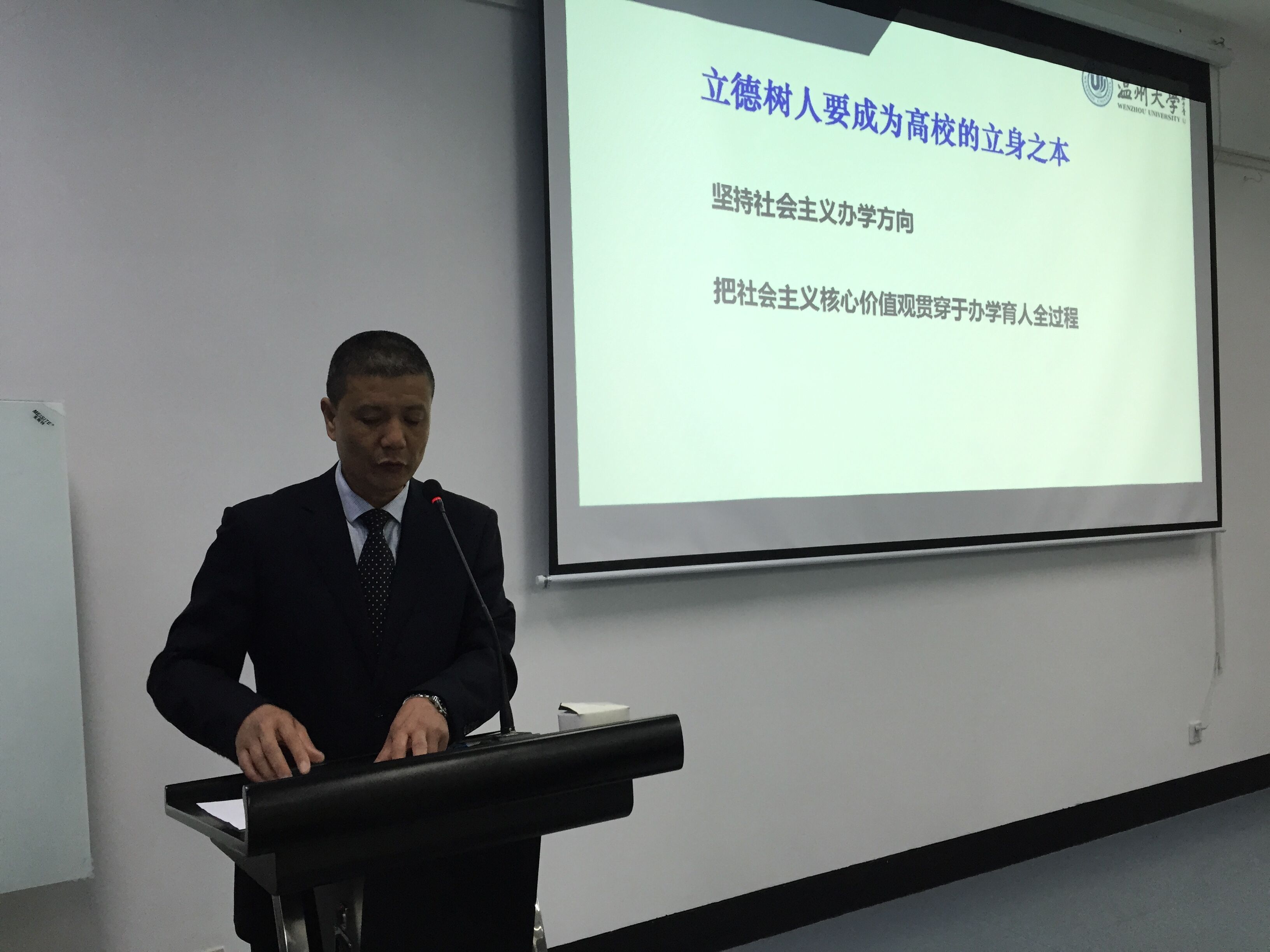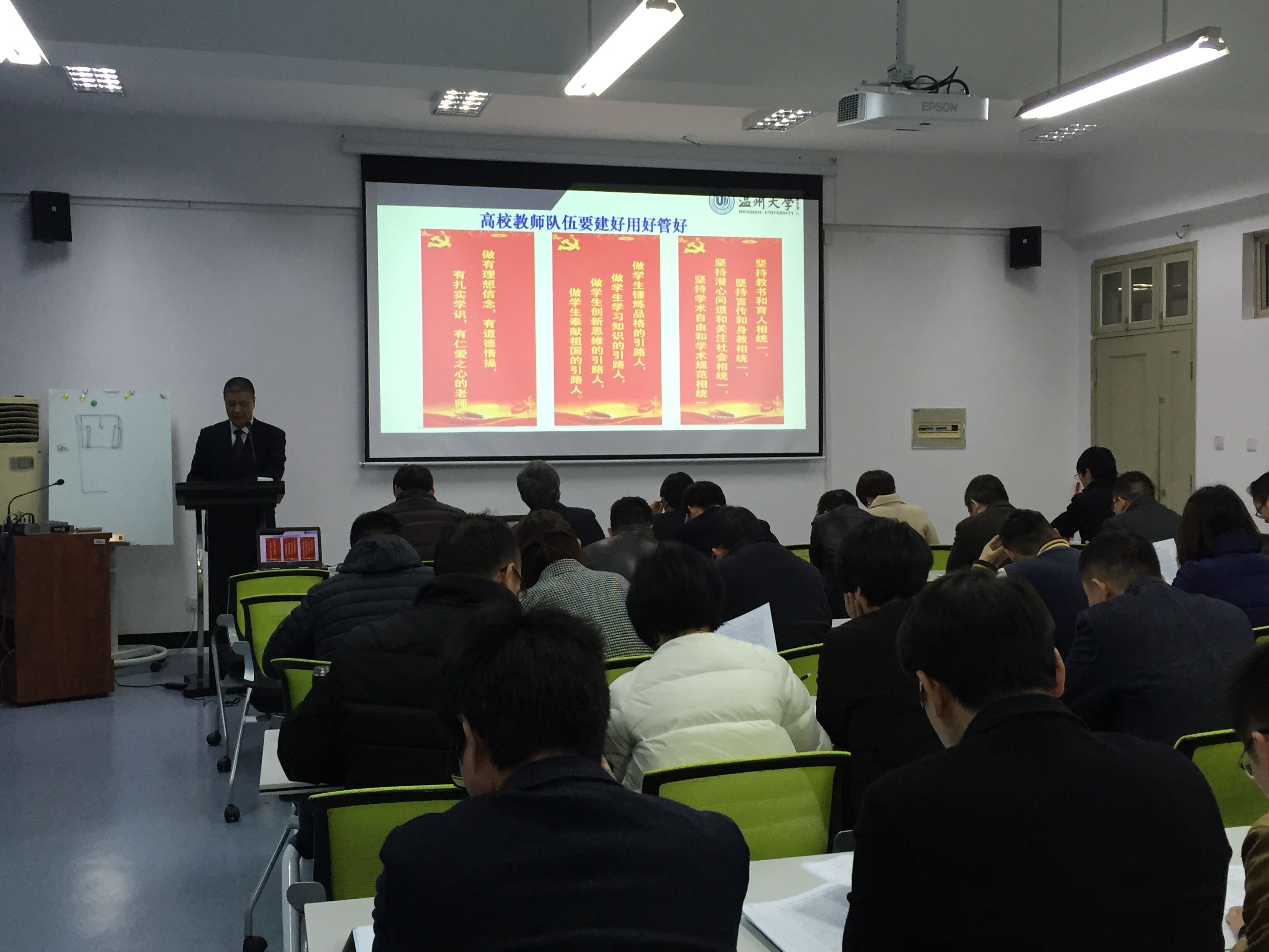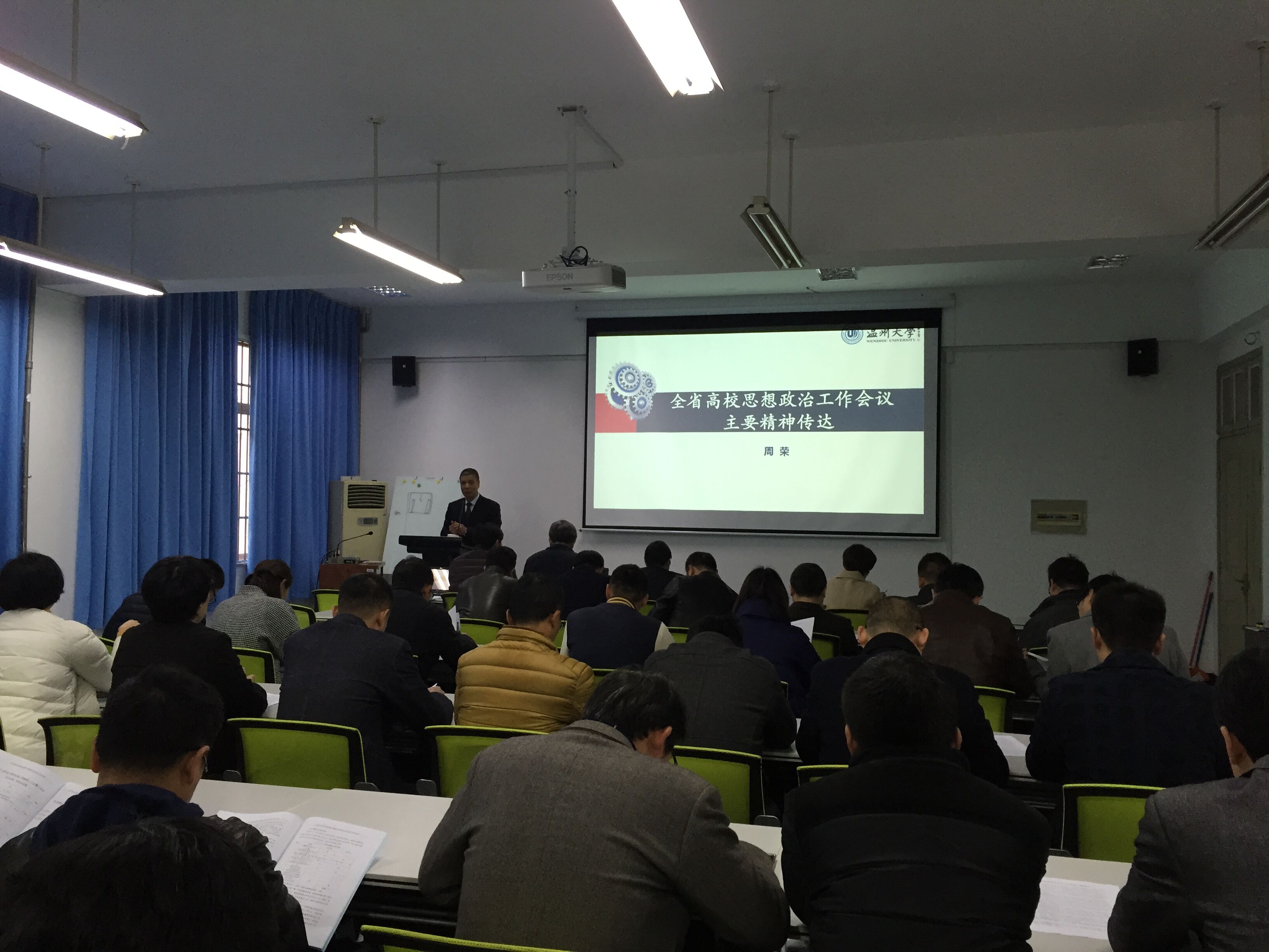 2017年3月17日,追新番 召开全院教职工大会,传达学习全国全省高校思想政治工作会议精神,党总支书记周荣主讲。