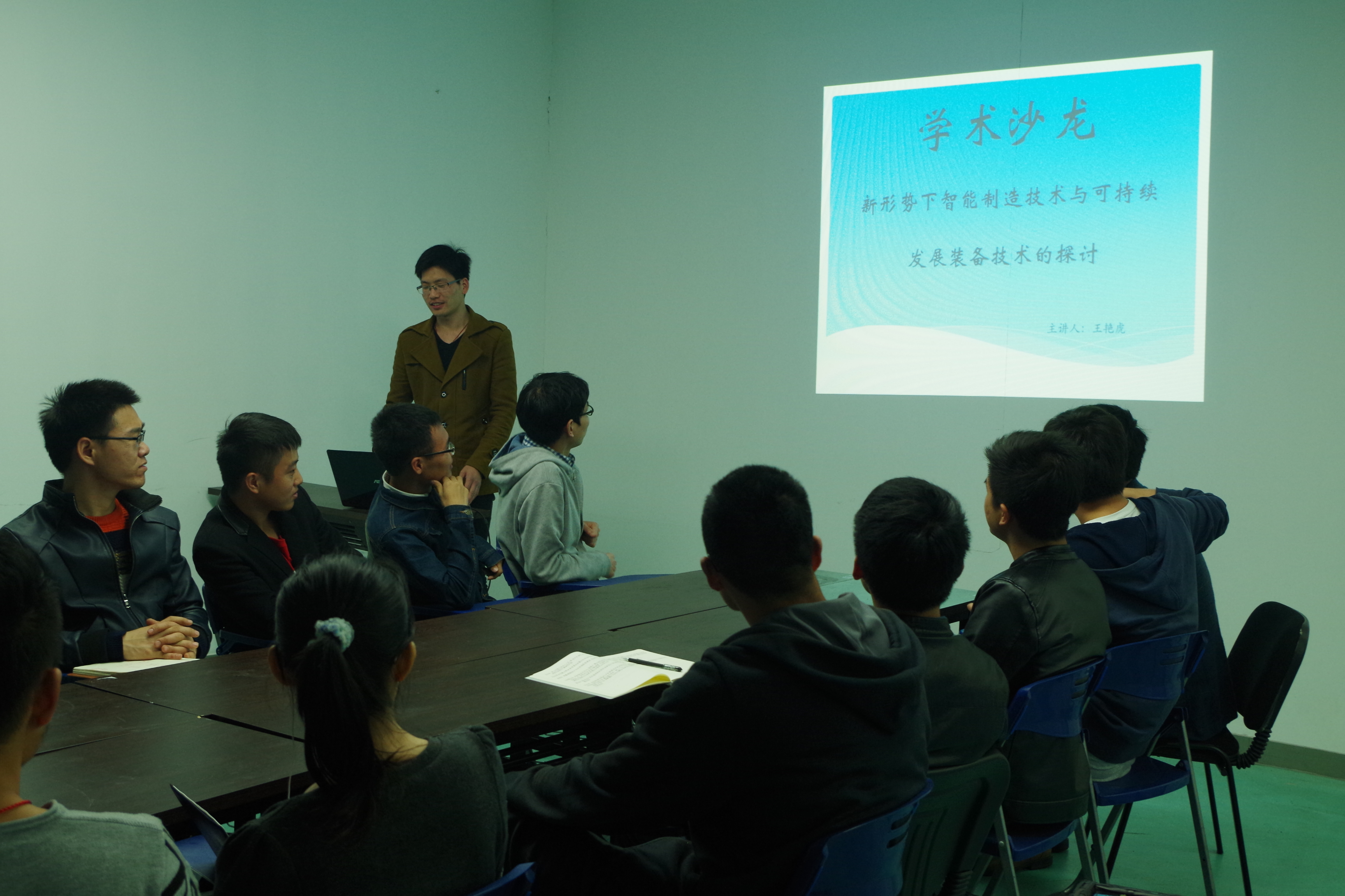 主讲人王艳虎分别从可持续发展概念、当前我国制造业所面临的一些列问题以及产业的转型升级这三个方面论述了我国作为一个新兴的制造业大国,现阶段所面临的发展压力仍然很大,制造业处于结构转型的攻坚期;广大研究生作为国家科技发展的主要推动力量责任依然重大。王艳虎同学结合自身的相关科研工作也向我们做了具体且可感的阐述,他号召我们所有与会同学:作为一名研究生,我们不仅要在学术科研上要有所作为,更应当在将科技成果转化为先进生产力上做出自己应有的一份贡献。