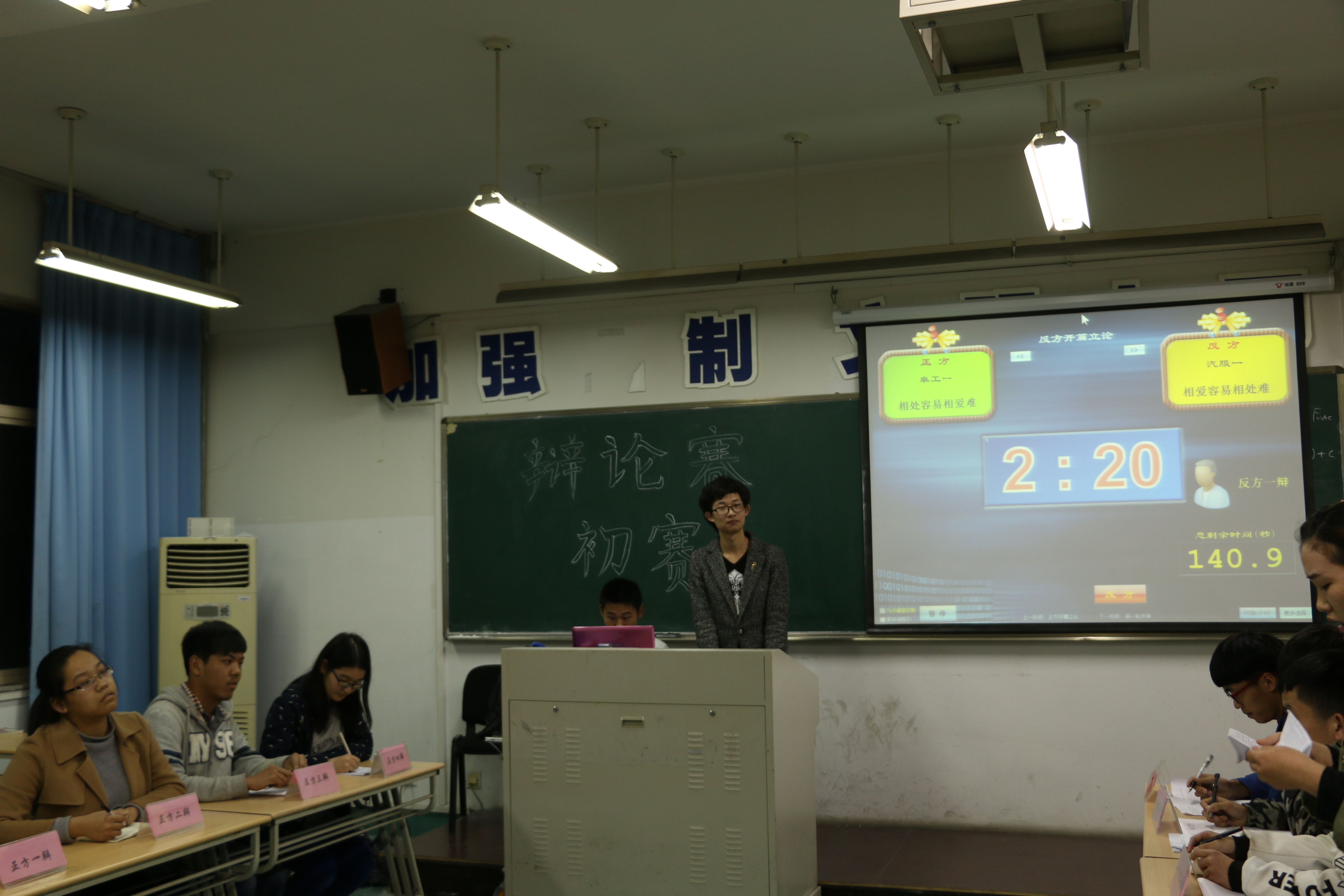 本次初赛邀请的评委有大二年级委员会成员以及团学干部。第一场的辩题是相处容易相爱难还是相爱容易相处难,正方明确指出爱是一种责任,是生命的诺言,是人与人之间的紧密联系,是深厚的感情,需要用心去经营。反方提出相处是个性的磨合,是人生观价值观的碰撞。第二场的辩题是电脑必将取代书本还是书本不会被电脑取代。随着时代的飞速发展,科技已经逐渐与人们的日常生活相互融合。正方表示电脑的地位将会愈演愈烈,反方则觉得信息安全问题以及劣质资源的传播使得书本的地位难以动摇。有评委提出如果电脑必将取代书本为什么大学课程中还会用到书本?这是因为在几千年传统下来,书本有其自身的魅力和价值,我们并没有养成事事依赖电脑的习惯。为了让同学们更加明确理论和实践的重要性,我们展开了以职业学校学一技之长比大学学理论知识强还是大学学理论知识比职业学校学一技之长强为辩题的第三场比赛。正方直言理论知识服务于技术,不经过实践无法了解背后隐藏的问题,而反方认为不加强理论学习,没有理论支撑和指导,无法科学精准的创造和实践。