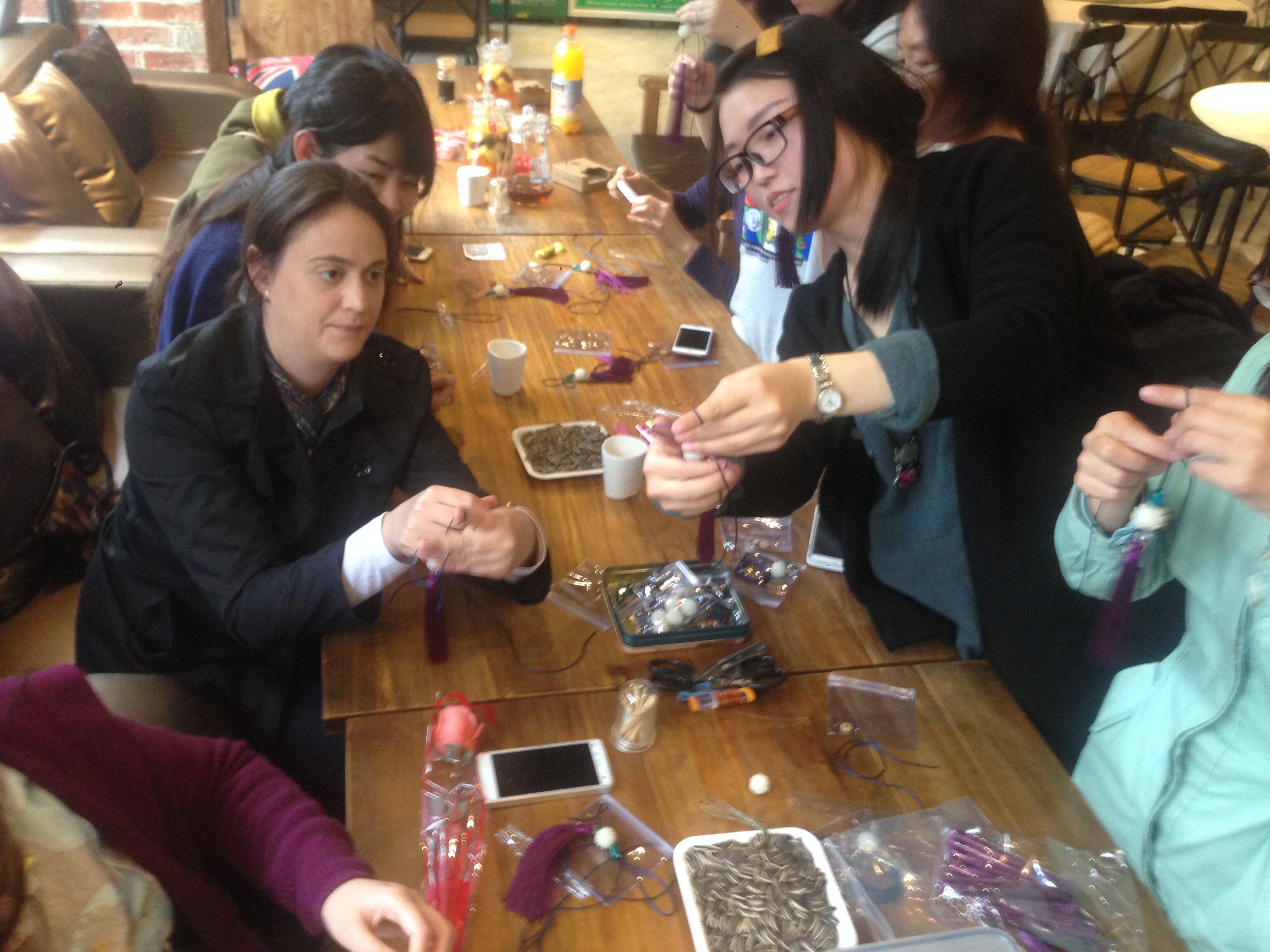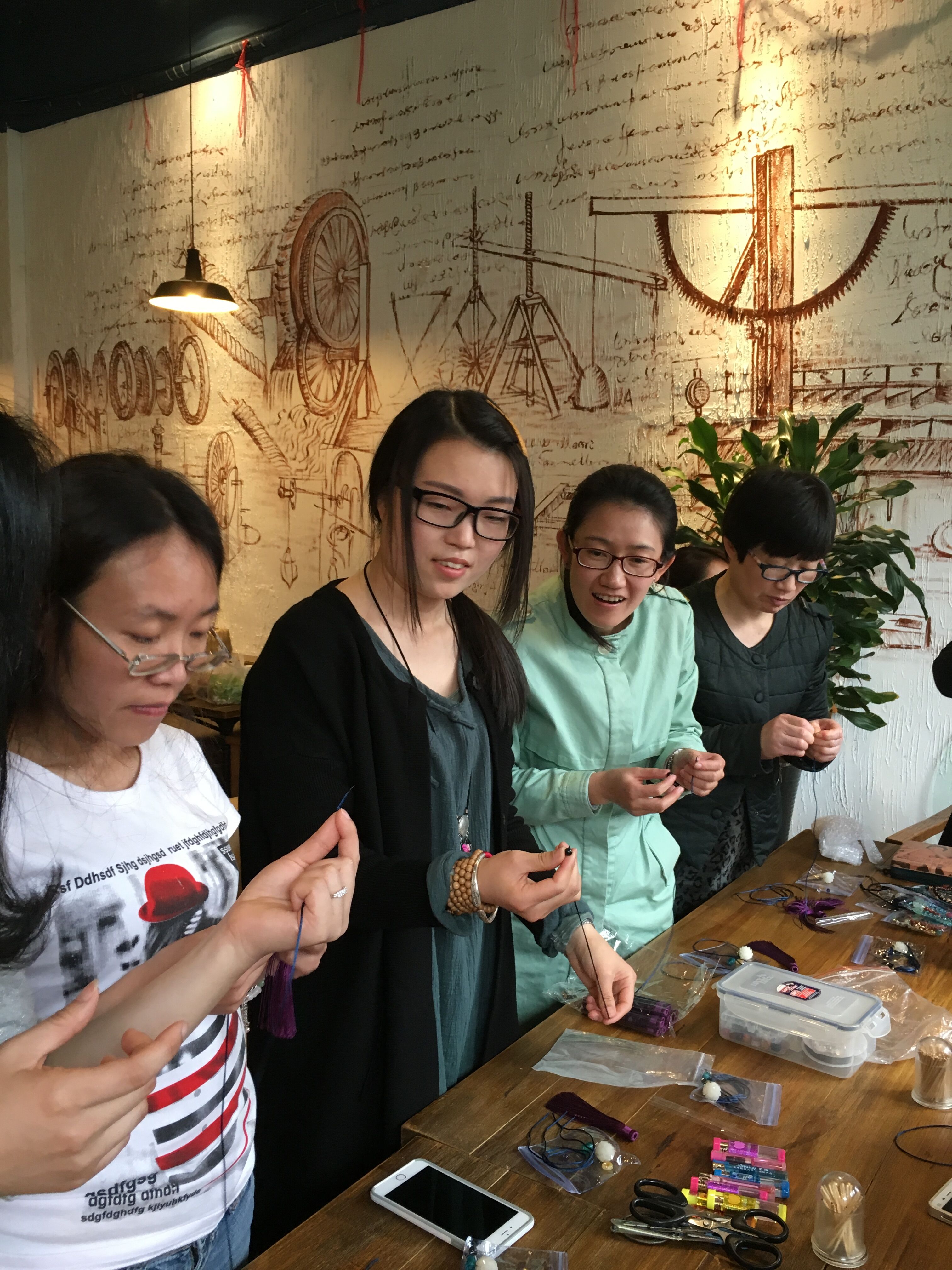 阳春三月,春风送暖,为了庆祝第106个国际“三八”妇女节,丰富追新番 女教工的业余文化活动,3月8日,学院工会组织全院女教工和女外教开展了一场别开生面的编绳串珠DIY活动。在专业老师的指导下,女教工们手下生花,平结、纽扣结、金刚结……将各种漂亮的白水晶、紫水晶和白玉菩提等珠子窜成美丽的手绳、项链和包挂等饰品。大家感觉到满满的成就感,纷纷都说又get了一项新技能。