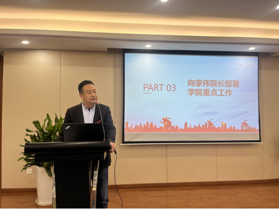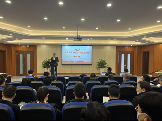 向家伟院长介绍学院2021年在各项工作上取得的成绩并部署新学年学院28项重点工作。他指出,2022年学院将开启新征程,加强党的领导,落实立德树人,聚焦强基筑峰,集聚创新创造,深化学城联动,扩大国际交流,强化综合保障,抓住机遇,奋发作为,书写机电学院高质量内涵式发展的奋进篇章,以实际行动迎接党的二十大胜利召开!