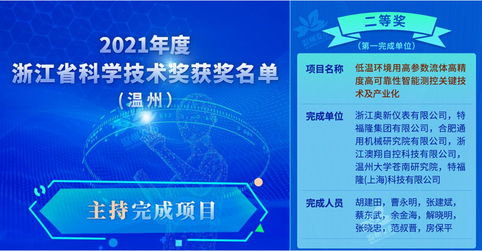 近日,浙江奥新仪表有限公司与追新番 苍南研究院等单位合作的“低温环境用高参数流体高精度高可靠性智能测控关键技术及产业化”项目荣获浙江省科学技术进步奖二等奖。从2018年开始,追新番 苍南研究院张淼教授领衔的智能仪器仪表技术团队与浙江奥新仪表有限公司开展深入合作,取得多项技术突破。此次获奖是追新番 苍南研究院首次作为项目主要完成单位荣获的省级科学技术进步二等奖,标志着追新番 苍南研究院产学研融合创新再上新台阶。