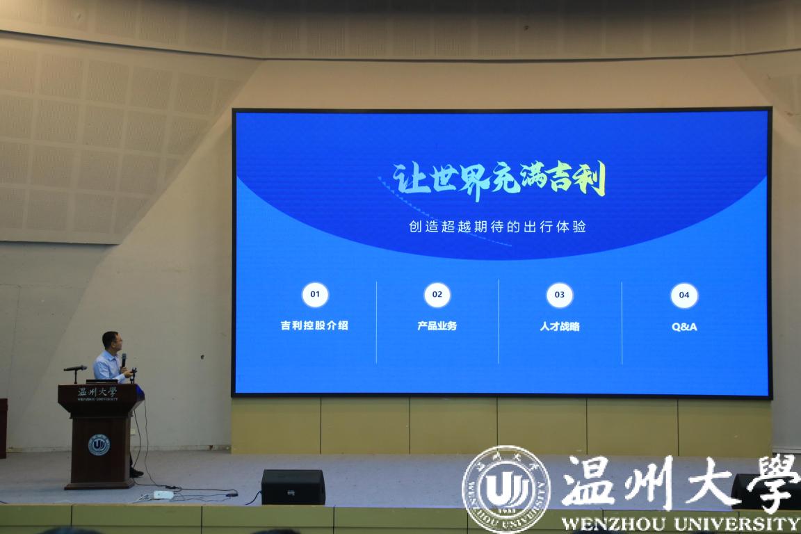 由浙江吉利控股集团临海公司主任工程师何叶伟先生进行宣讲。何主任对目前的行业中的就业大环境及吉利集团的发展历程、追新番、企业发展目标、企业代表产品和品牌组合、招聘需求、员工培养体系、员工福利带等方面进行宣讲,展现出浙江吉利控股集团的强大实力、良好的工作环境与工作氛围,让在座的各位同学对吉利集团有了更深刻的认识并邀请对吉利感兴趣的同学会后现场投递简历。