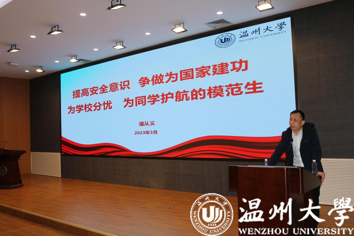 宣传部潘从义副部长主讲了《争做为国家建功、为学校分忧、为同学护航的模范生》思政课。他分析了当前国际国内形势,重点回顾了我党和国家在过去一年中所取得的伟大成就,特别强调了我党和国家面对三年疫情,始终把人民群众生命安全和身体健康放在第一位,展示了中国精神、中国力量、中国担当。他回望了中华民族近百年来来之不易的奋斗之路,深入分析了当前我国意识形态领域的严峻形势,并就做好我校意识形态工作和网络安全管理提出防范要求。