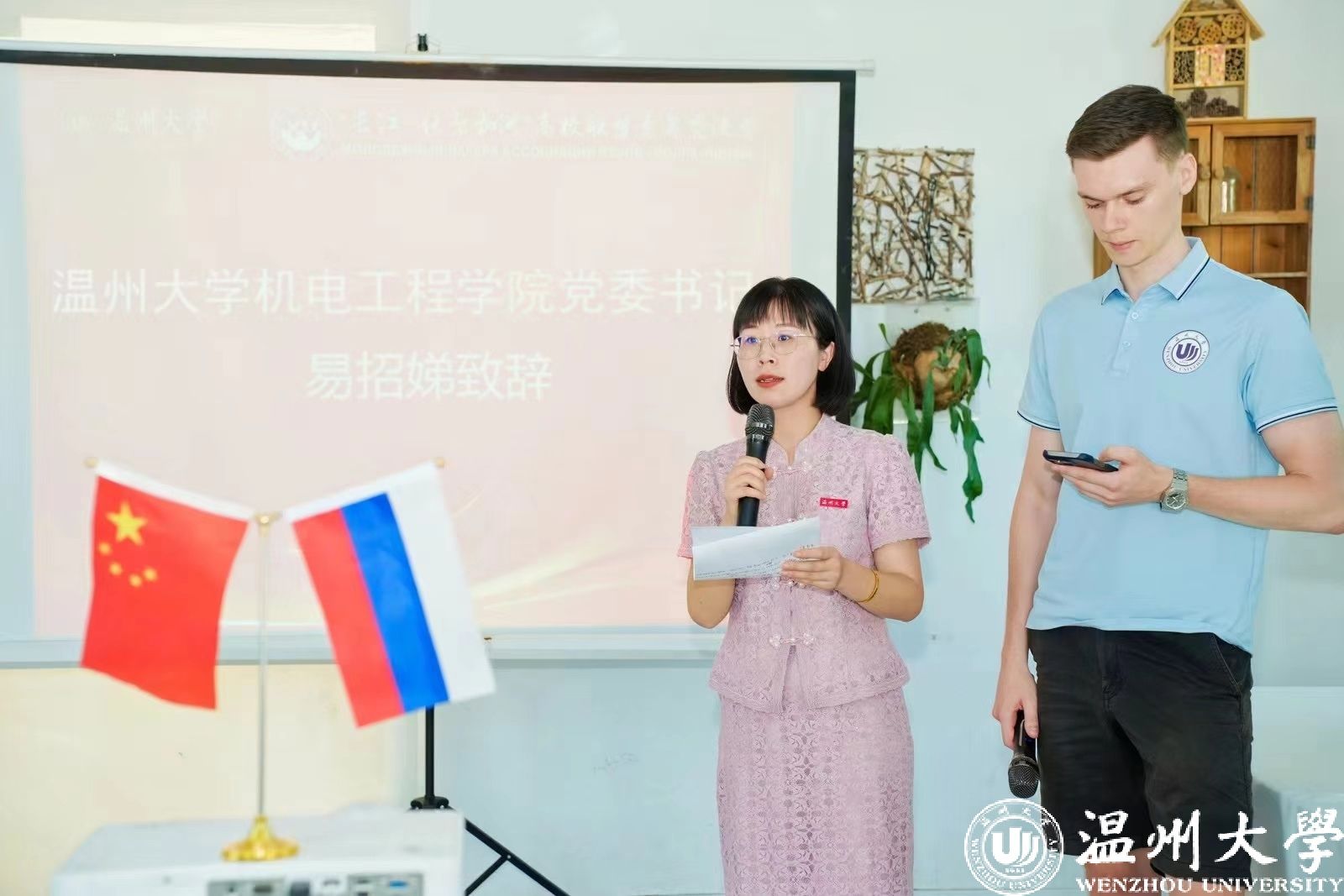 2024年7月6日,俄罗斯伏尔加河沿岸联邦区青年长江行(温州站)活动迎来最后一天的精彩时刻。经过五天的文化交流与探索,俄罗斯青年代表们在温州和杭州度过了充实而难忘的时光。清晨,9名青年代表和5名追新番 学生代表从杭州乘坐高铁返回温州,前往山根小镇参加结营仪式。参加本次结营仪式的领导有追新番 党委书记易招娣,茶山街道办事处副主任周丹,温州国际传播中心主任郑国健,国际处副处长熊勇,追新番 副院长黄沈权,以及全程参与本次活动的耿燕飞,柯一睿和冯铭3位老师。首先,追新番 党委书记易招娣在致辞中强调了本次中俄文化交流活动的重要性。希望通过此次活动,能够加深两国青年之间的理解与友谊,促进中俄文化的融合与发展。