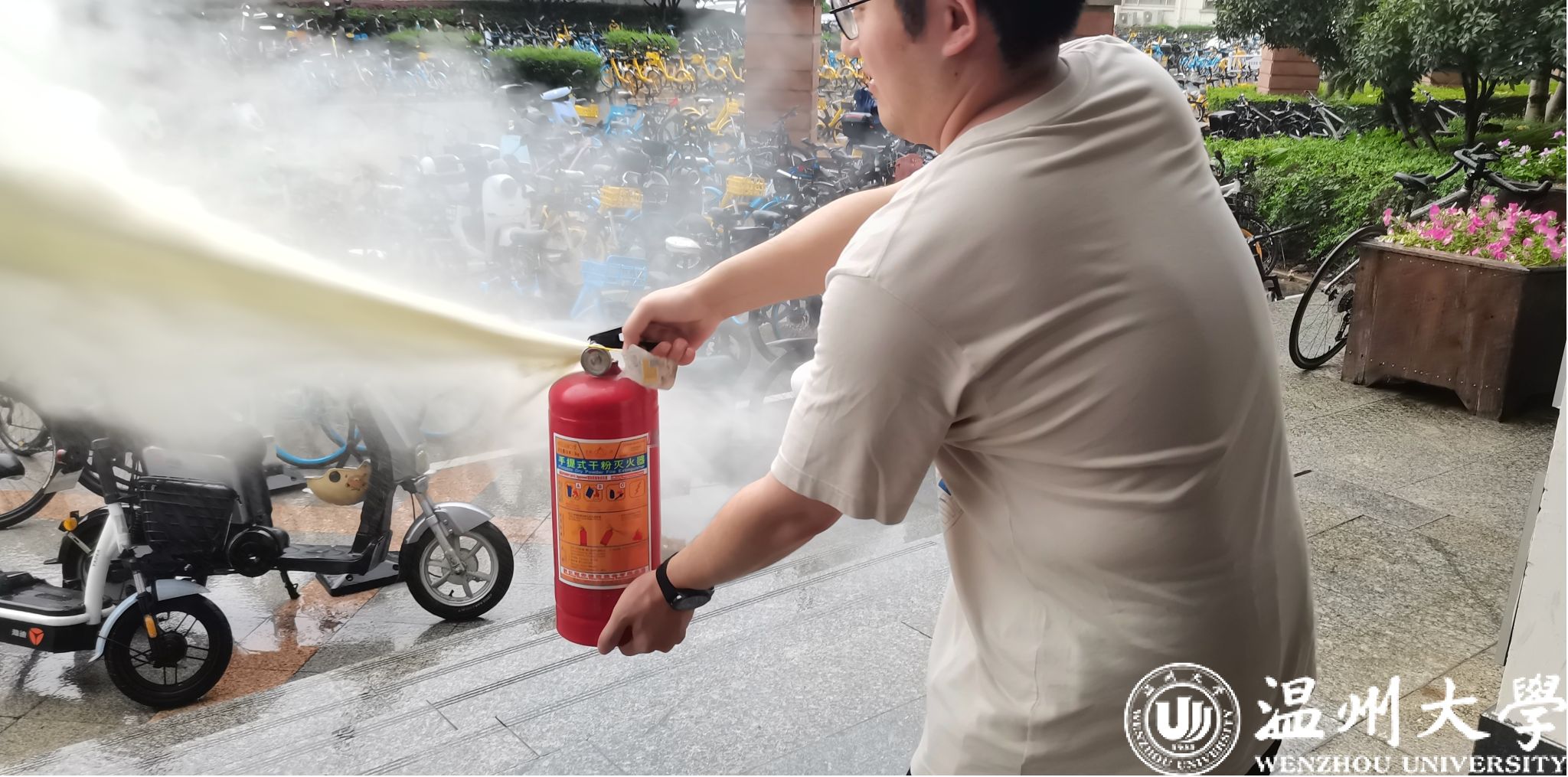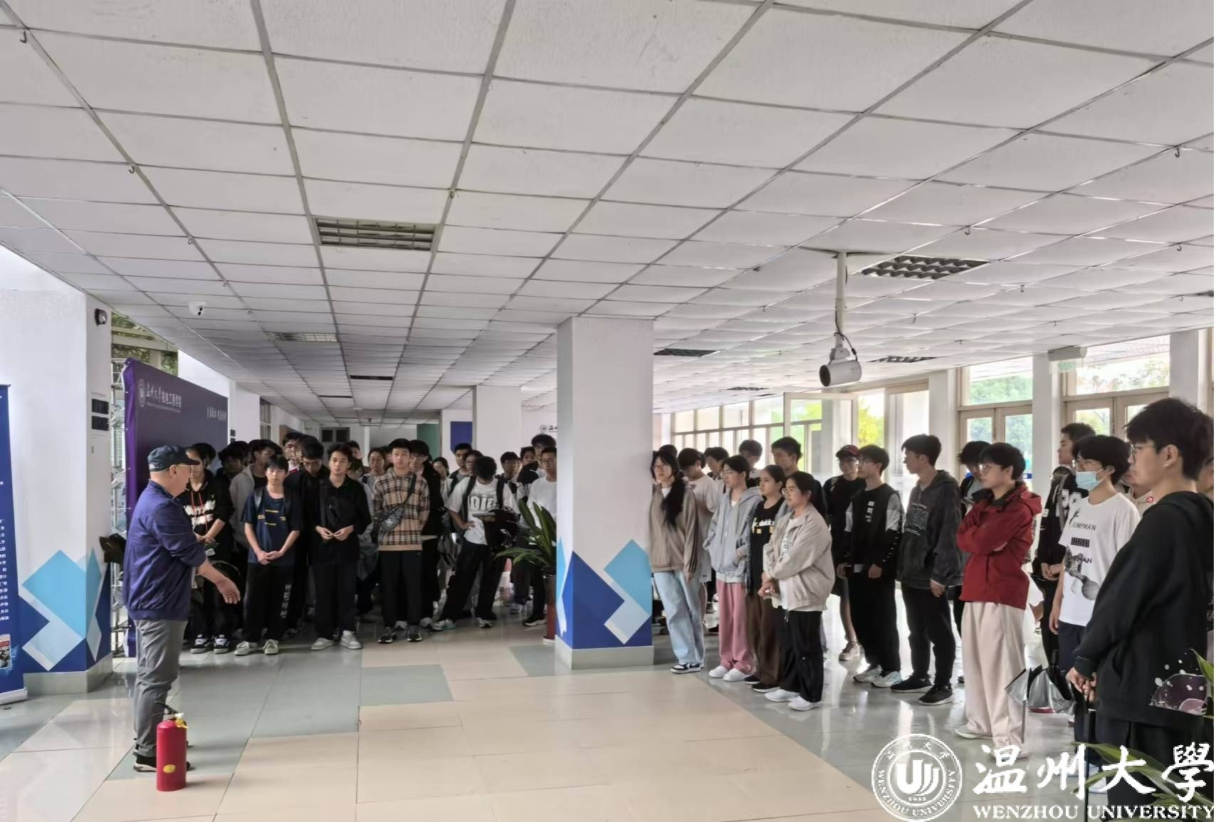 在全体师生到达安全点集合并完成人数清点后,凌建国老师在机电楼一楼为师生带来干粉灭火器的使用指导,传授“一提二拔三握四压”使用口诀,并亲自操作示范、邀请同学上前操作感受,体验如何灭火。