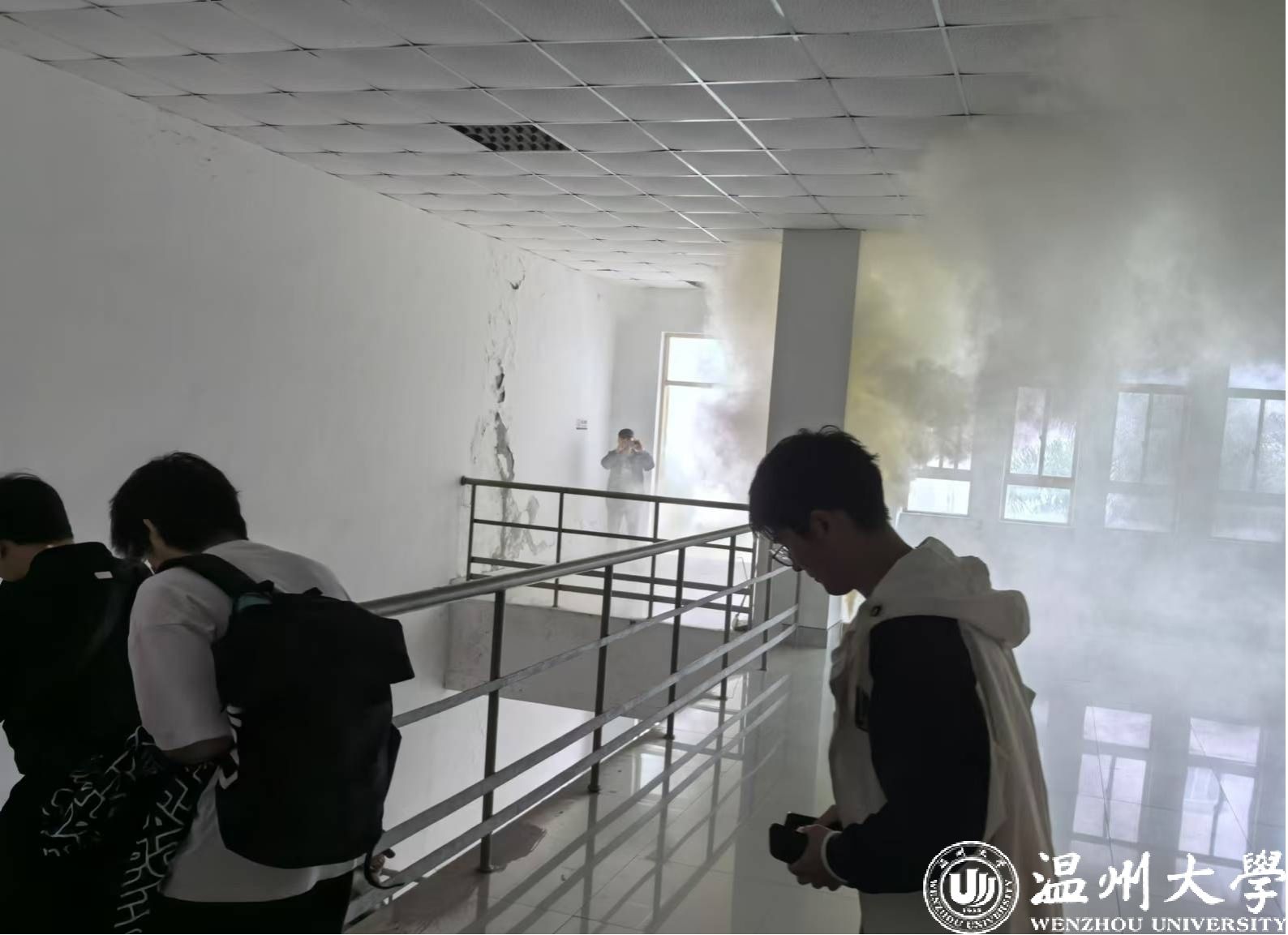 在演练过程中,林博远老师发现B座309发生火情后,立即组织全院学生疏散撤离,并拨打学校监控中心电话请求支援。
