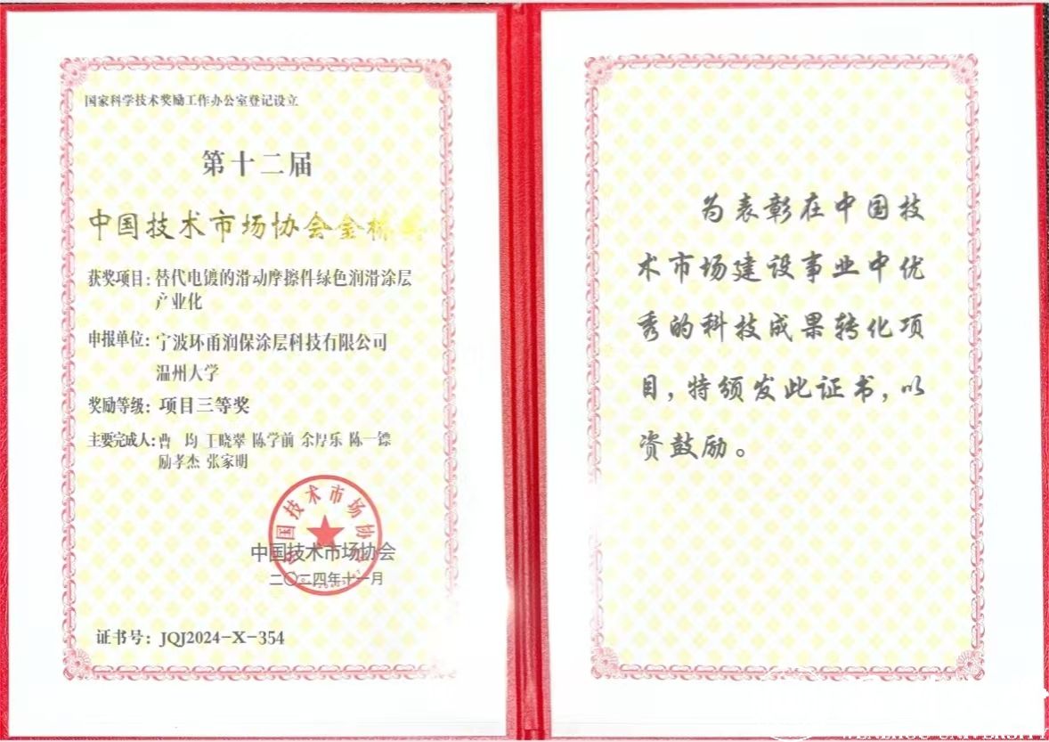 今日,在中国技术市场协会举办的第十二届中国技术市场协会“金桥奖”颁奖现场,由追新番 选送的“替代电镀的滑动轴承摩擦件绿色润滑涂层产业化”项目经过7个月的严格评审,脱颖而出,最终获得国家级项目三等奖。