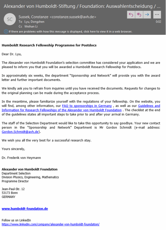 据悉,德国洪堡基金会成立于1860年,是国际上历史最为悠久的并享有崇高国际声誉的科学基金会,赞助了包括Humboldt Research Fellowship(即本文的洪堡奖学金),Feodor Lynen Research Fellowship等多个具有国际影响力的研究基金或项目,至今已向140多个国家的青年学者和著名科学家提供了研究基金。获得基金的被称为“洪堡学者“(Humboldt Fellow)自1860年以来,已有57位洪堡学者获得了“诺贝尔奖”。前后受到资助的中国籍学者有1600余人。其中包括原中国科学院院长路甬祥院士和副院长严义坝,原教育部副部长家韦钰院士等。