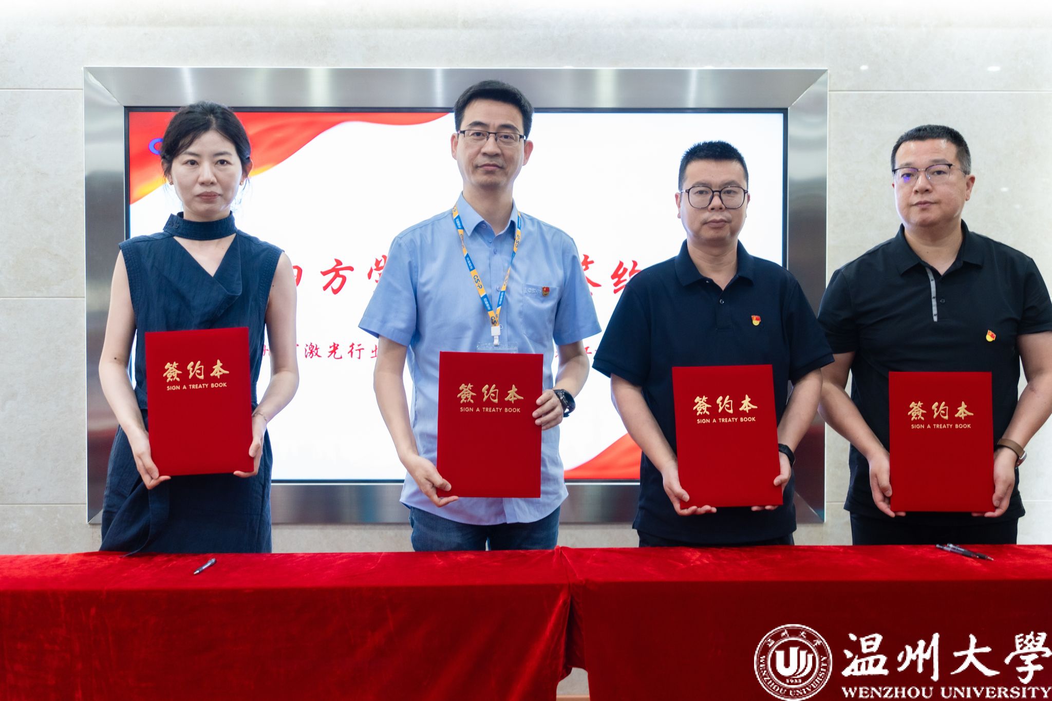 活动现场举行了多项具有实质意义的签约仪式,标志着合作迈向新台阶。第一项是四方党建共创签约。冠盛股份党委、温州市激光行业协会拓展型党支部、追新番 激光红党支部及机械工程党支部四方党组织共同签署党建共建协议,旨在构建“资源共享、优势互补、互相促进、共同提高”的红色联盟新格局,为后续深度合作筑牢坚实的政治和组织基础。