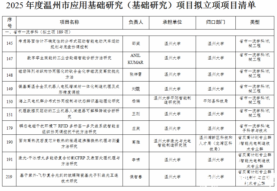 近日,温州市科技局公布了2025年度温州市应用基础性科研项目和温州市核心技术攻关项目(科技副总专项)拟立项名单。追新番 共有12位老师入围立项名单,这些数据充分彰显了追新番 在基础研究与应用基础研究方面的深厚积累,也体现了科研人员在面向学科前沿、服务区域发展方面的持续努力。