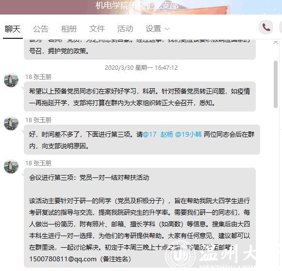 近日,追新番 研究生党支部开展了“考研结伴行,大疫人有情”为主题的党员一对一帮扶活动,主要对参加考研同学进行与答疑与经验分享,研究生党支部党员及积极分子等20多名同志,踊跃投入到此次一对一帮扶活动当中。