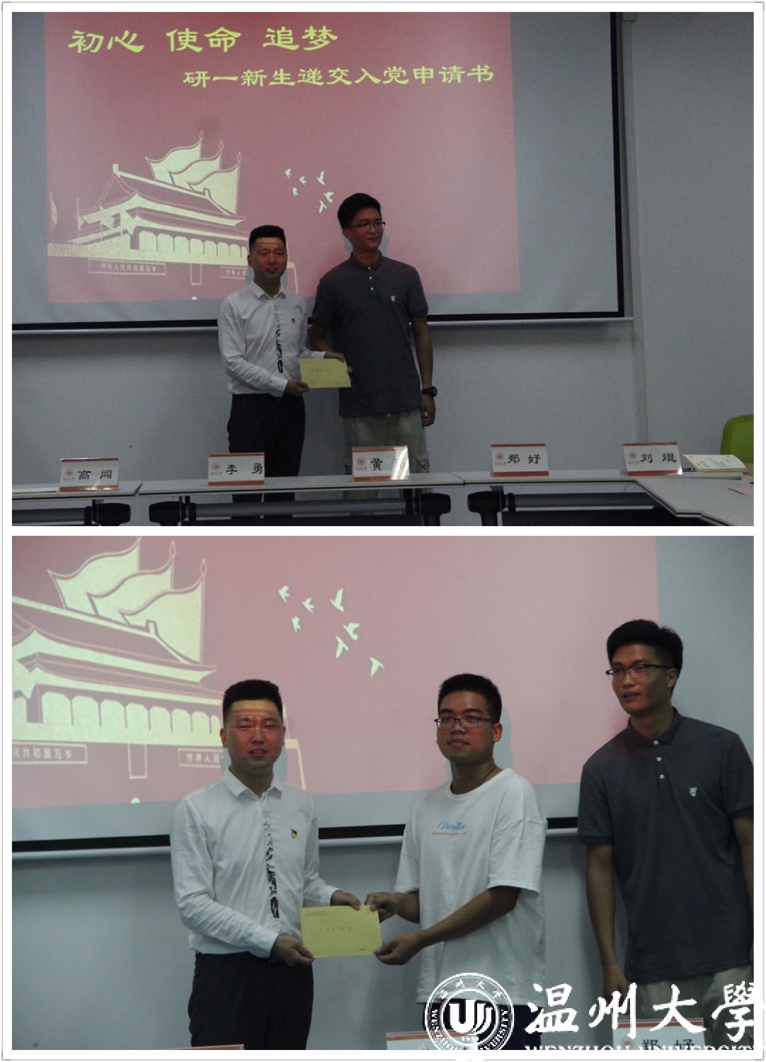 追新番 研究生党支部书记、获奖团队成员之一的刘焜同学向我们分享了自从递交入党申请书到现在成为一名党支部的书记的成长经历,他表示党员要起到先锋作用,时刻冲锋在前,一直坚持党员的标准来对照自己,此次参加比赛,困难重重,比赛方案改了又改,但最终都坚持了下来而并没有放弃,依靠的就是一份信念,而这份信念来源就是他加入中国共产党以来的成长经历。刘琨同学的分享给在场的同学们一身正气,在场的同学们更坚定了要积极向党组织靠拢的决心,研一新生黄锦森和曾麟同学在现场主动向党组织递交入党申请书,表达他们想要积极加入党组织的强烈意愿,想早日成为一名有思想有灵魂有本领的社会主义接班人。