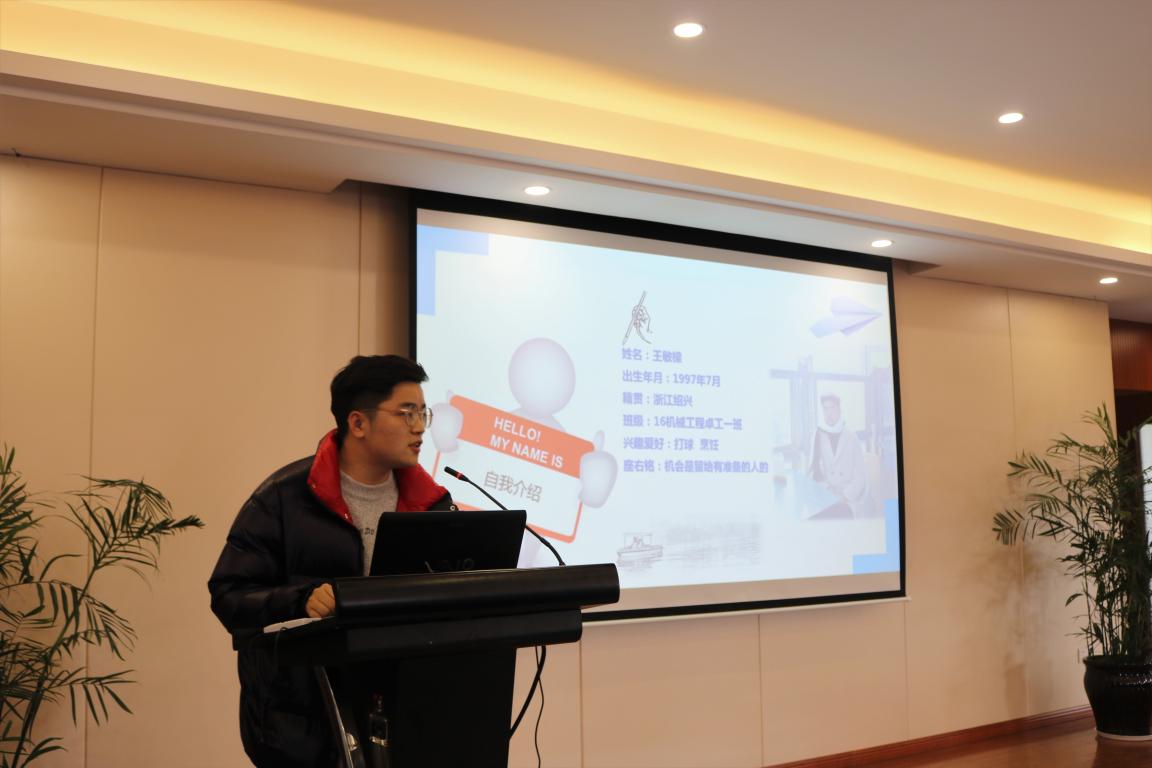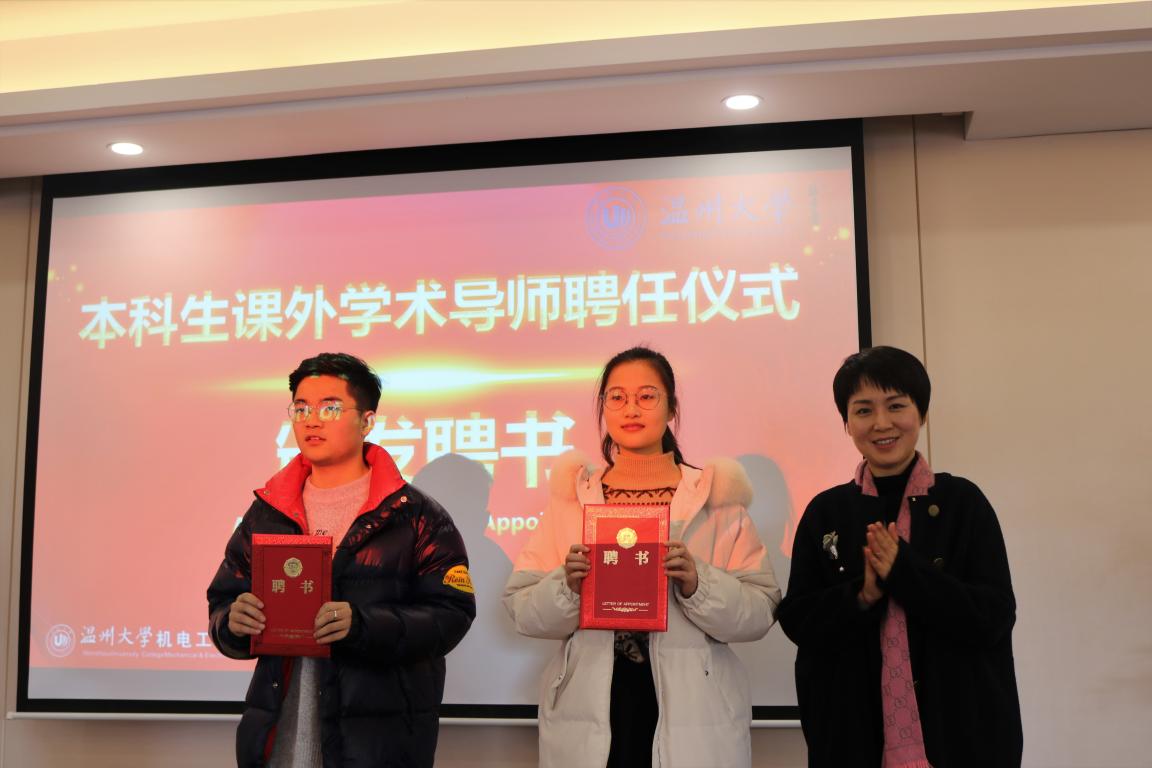 活动伊始,由主持人即外事专员李舒琦用英语介绍到场嘉宾与两位本次受聘的优秀学生------2015机械工程(国际化)龚玲艳与2016机械工程(卓工)王敏梁。随后,由颁奖嘉宾李密副书记为两位同学颁发聘书并合影留念。