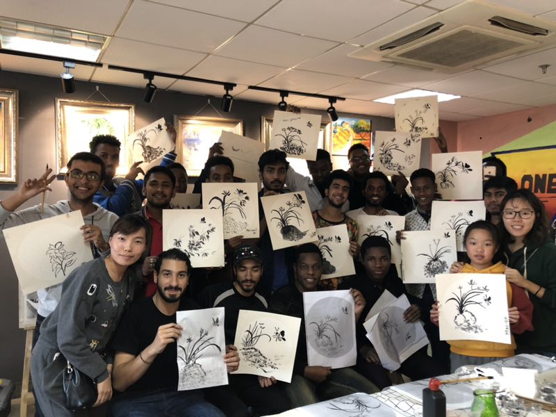 在绘画课开始之前,老师先让外国留学生进行暖身活动——筷子夹弹珠。现场的同学们有说有笑、互动歌唱,氛围一下子活跃起来。随后正式开始国画教学,老师讲解完石头、兰花及蝴蝶这几个部分的画法之后,亲自为学生演示。外国留学生认真投入,不少留学生的作品收到了老师的赞赏。大家对此次绘画活动都表现出了极大的热情和喜爱。