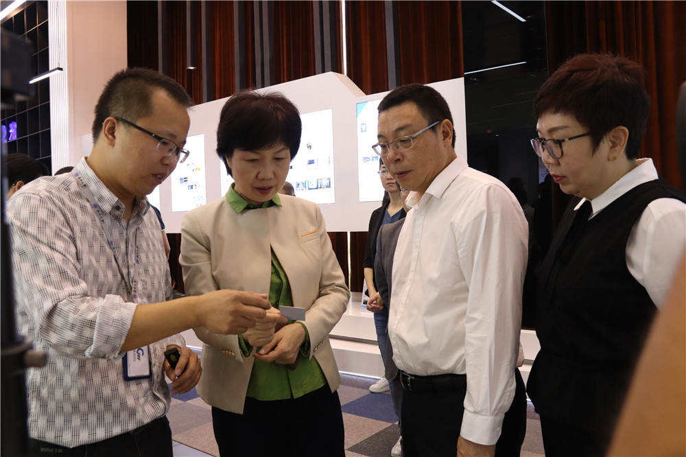 郑朝阳一行首先参观了研究院的展厅,听取了关于展厅建设主旨、人才团队、科研成果等介绍。在介绍到研究院科技成果展示版块时,郑朝阳饶有兴趣地拿起了激光无油墨打印技术的样品观看,还询问了激光印刷与传统印刷相比的优势和特点。