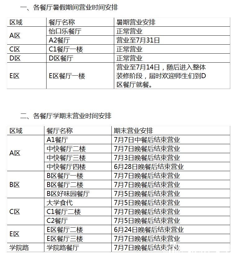 根据学校放假的通知精神,现将各餐厅学期末及暑假期间营业时间安排如下: