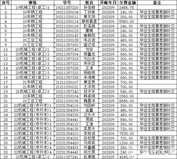 根据学校计财处反馈,截至2024年5月29日,追新番 如下33名同学仍存在学费欠费情况,根据《追新番 学生收费管理办法》温大行政[2014]133号文件规定,第六条,学校对欠费学生进行7天公示,公示期满后如仍然欠费的,本学期做休学处理。第八条,学生在毕业前缴清所有学宿费的,学校提供成绩证明和办理离校手续。请各位同学及时缴纳相关费用,名单如下: