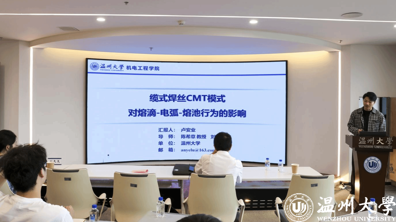 卢安业同学的《缆式焊丝 CMT 模式对熔滴-电弧-熔池行为的影响》则回归工程实践,通过实验数据与动态模拟,分析了不同焊接模式下的工艺特性,为优化焊接质量提供了技术支撑。