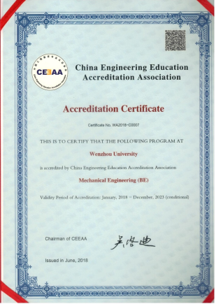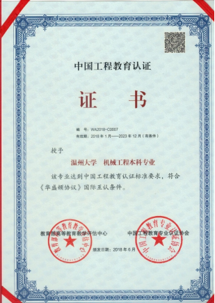 我校机械工程专业于2018通过中国工程教育认证协会的工程教育专业认证。通过专业认证,标志着本专业的质量实现了国际实质等效,进入全球工程教育的“第一方阵”,毕业生在《华盛顿协议》相关国家和地区申请工程师执业资格或申请研究生学位时,将享有当地毕业生同等待遇,为毕业生走向世界提供了国际统一的“通行证”。