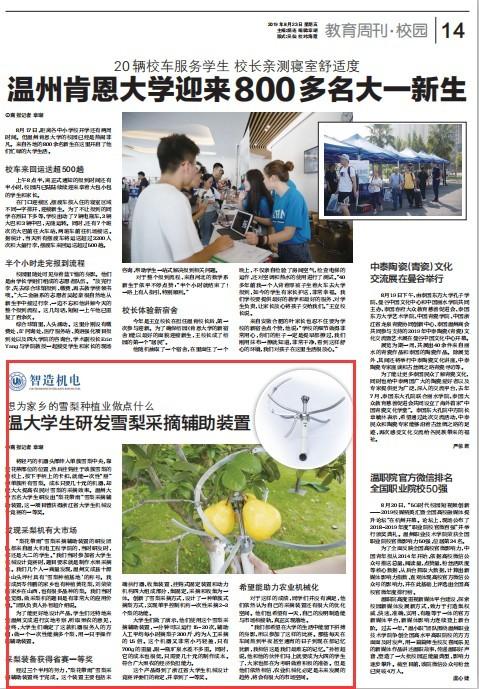 发现采梨机有大市场“梨花带雨”雪梨采摘辅助装置的研发团队都来自温大追新番 的,当时研发时,都还是大二的学生。“我们当时参加省大学生机械设计竞赛时,题目要求就是制作水果采摘机。我们几个人一商量发现,温州文成县十源乡山头坪村具有‘雪梨种植基地’的称号。我和成员岑伟鹏的家乡也有种植黄花梨,刘荣荣的家乡在山西,也有很多品种的梨。我们当时就觉得,做采梨机的题目是有非常大的应用价值。”团队负责人孙智超介绍说。