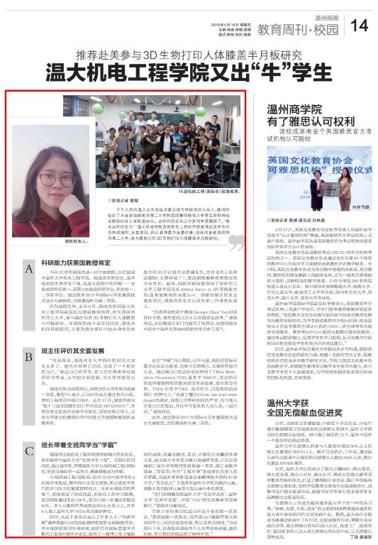 今年大四的温大女生邬佳欣最近成为学校里的小名人,她同时收到了来自新加坡南洋理工大学和英国曼彻斯特大学等五所世界知名院校的硕士录取通知书。这样的机会也让许多同学羡慕极了。“她有这样的实力!”温大机电学院负责学生工作的李密老师谈及学生的各种成绩时,如数家珍,但让老师最为自豪的是,邬佳欣曾赴美国得州理工大学,参与最前沿的3D生物打印人体膝盖半月板研究。