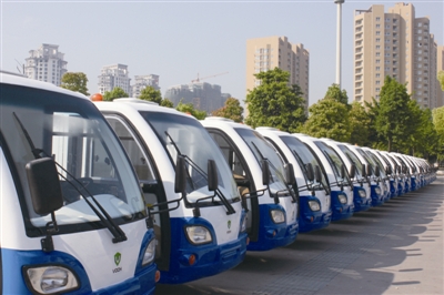 | 成立仪式上亮相的四轮电动环卫车。 卢静 摄