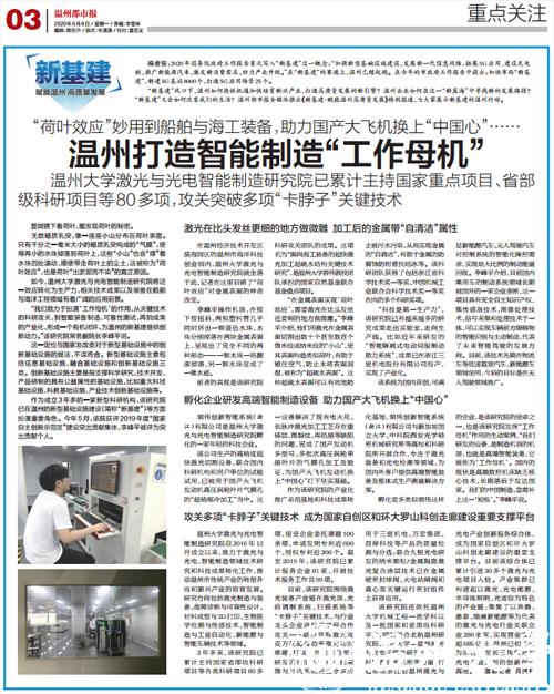 该研究院还依托追新番 机械工程一流学科以及一批国家和省部级科研平台,同时整合北航温州研究院、北京大学-温州激光与光电子联合研发中心、中科院西安光机所等力量,打造形成浙江省温州激光与光电产业创新服务综合体,成为国家自创区和环大罗山科创走廊建设的重要支撑平台。目前该综合体已累计引进30多个激光与光电项目入驻。产业集群已构建起以激光、光电能源、半导体照明、光通信为特色的产业链,集聚了以奔腾、嘉泰、瑞浦新能源等为代表的激光与光电行业关联企业280余家,实现营业收入超685亿元,温州已初步成为浙江乃至长三角激光与光电产业应用的创新创业高地。