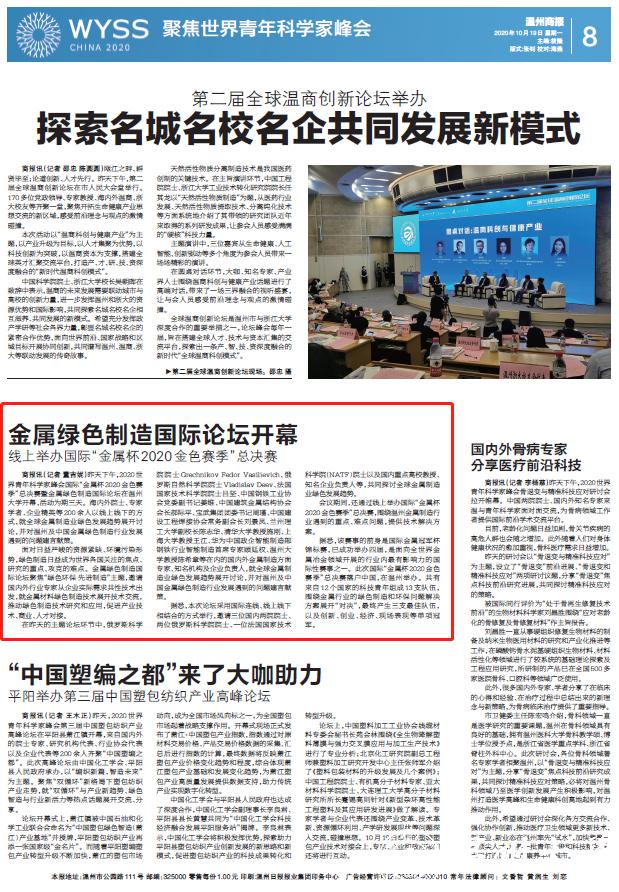 开幕,活动为期三天。海内外院士、专家学者、企业精英等 200 余人以线上线下的方式,就全球金属制造业绿色发展趋势展开讨论,并对温州及中国金属绿色制造行业发展遇到的问题建言献策。