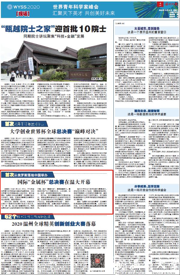 本报讯(记者 周大正)昨日,作为首届世界青年科学家(温州)峰会的重要成果、2020世界青年科学家峰会核心活动项目,第五届国际“金属杯2020金色赛季”总决赛在追新番 举行。据悉,这是该项赛事总决赛首次走出俄罗斯,落地中国举行。