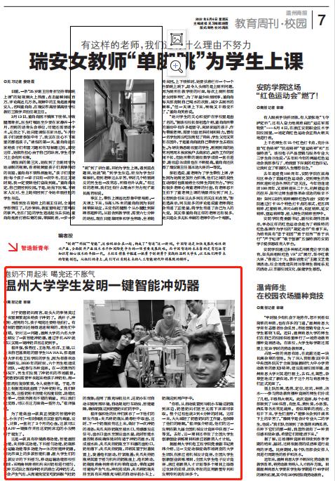 据追新番 党委副书记黄玮介绍,这一支爱动脑爱做市场调查的大学生团队在浙江省机械设计竞赛、全国大学生创新创业训练项目、全国大学生电子设计竞赛、浙江省新苗人才计划等多个项目上取得过优异的成绩,团队申报的实用新型专利和发明专利就有20多个。