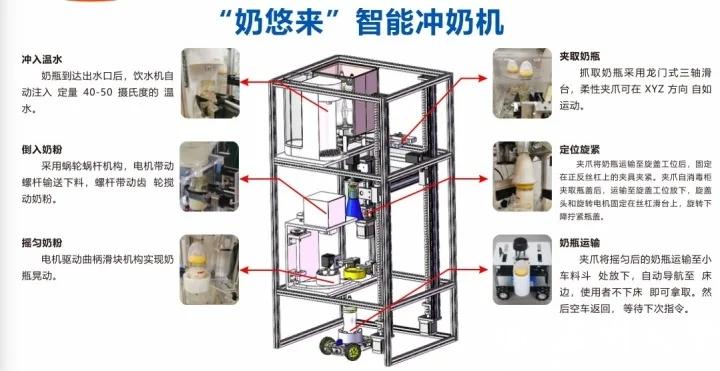 崔泽强和他的伙伴们演示了一下他们的研发作品:夹爪将奶瓶从消毒柜中取出,这时,下一个奶瓶被传送上来,做好下一次冲奶的准备;夹爪夹持奶瓶至接水口,传感器发送信号,出水口出水至预设出水量,此时智能水温控制系统确保随时有适于冲奶的温水;完成接水后,夹爪夹持奶瓶至下料器的出粉口,奶粉落下;夹爪夹持奶瓶,并将其置于封盖装置上,旋盖电机驱动,拧紧瓶盖;夹爪夹持奶瓶将其置于摇匀机构的奶瓶座上,电机转动,奶瓶随着曲柄滑槽机构单向运动,单向运转可避免产生气泡;冲泡完成后,夹爪将奶瓶夹持至具有采用激光导航的自动导航小车上,奶瓶送到用户手中。