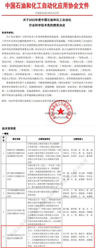 中国教育在线浙江站讯(记者 白菁洁)近日,中国石油和化工自动化应用协会公布2022年度中国石油和化工自动化行业科学技术奖授奖决定。以追新番 为第一完成单位,由追新番 冯子明教授、向家伟教授和黄沈权副教授等完成的“油杆泵井优化运行节能技术及规模应用”项目荣获2022年度中国石油和化工自动化行业科学技术奖技术发明一等奖。