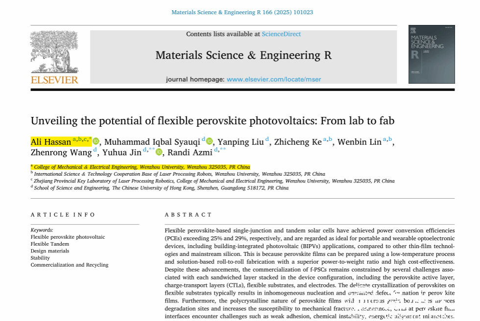 近日,追新番 外籍教师Ali Hassan博士作为第一作者兼通讯作者,在国际著名综述期刊《Materials Science & Engineering R: Reports》发表了题为《Unveiling the potential of flexible perovskite photovoltaics: From lab to fab》的长篇综述论文。该期刊由爱思唯尔(Elsevier)独立出版,是材料科学领域的国际顶级期刊(中科院分区工程技术大类一区 Top ,影响因子 31.6)。