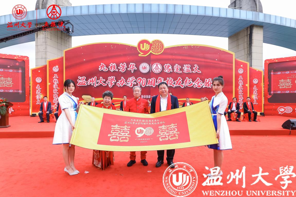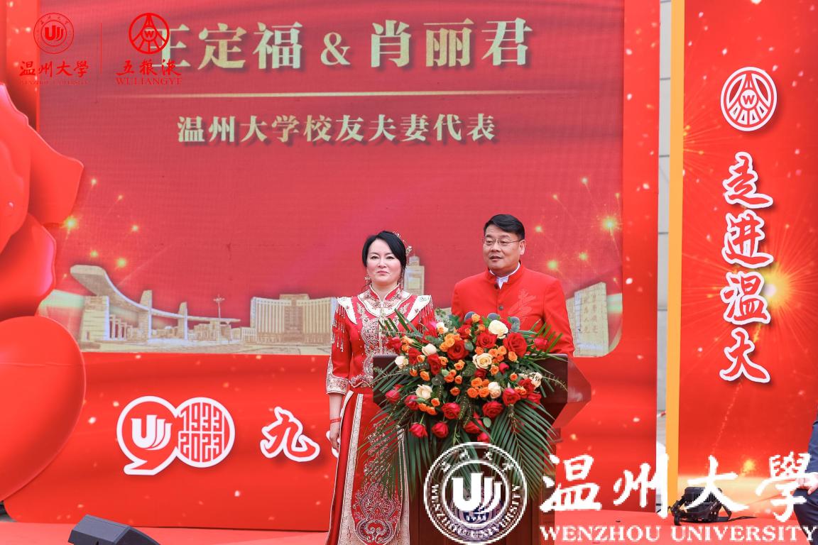 校友代表王定福、肖丽君夫妇发言,杨成玉、施品真夫妇向母校送上满载156对校友夫妻祝福的卷轴。“今天全天下最浪漫的莫过于母校温大,90华诞,156对校友集体向母校告白!”校友深情的说,是温大让爱升温,是母校温大让学子懂得了什么是学高为师、身正为范;是母校温大让学子懂得了什么是求学问是、敢为人先;是母校温大让学子懂得了什么是光大国族、造福人群。