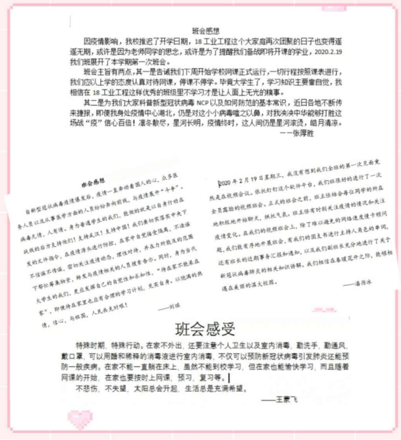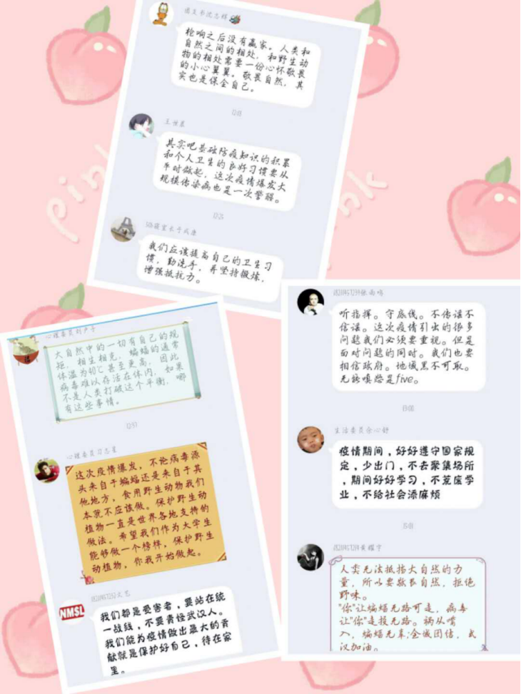 在班主任彭志辉老师的组织下,就同学们寒假的学习情况进行了充分交流,并对学校的相关纪律要求精神进行传达,在对新型肺炎疫情防控知识进行讲解时,就“疫情引发的大学生思考”,同学们进行了踊跃发言。