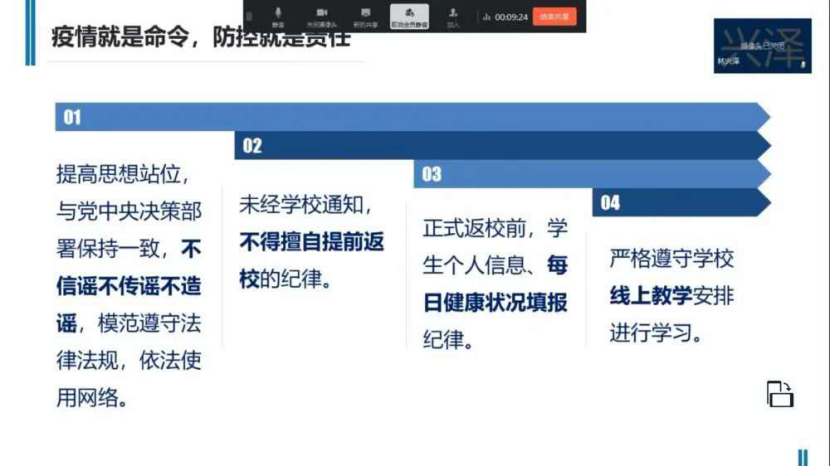 此次网络主题班会主要围绕寒假生活学习情况交流、新冠肺炎疫情防控知识、疫情引发大学生的思考、爱国主义教育以及相关纪律要求和信息等内容展开。接下来就跟着小编一起来感受下部分班级开展网络主题班会的盛况吧。