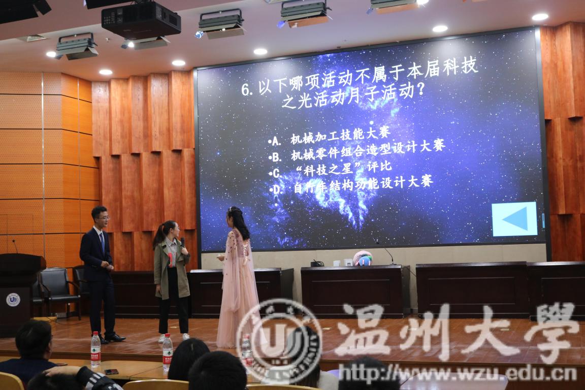 优秀学长代表王敏樑学长上台与我们分享了他与“科技之光”活动月的故事,充分激发了同学们的参赛热情。随后,就到了激动人心的有奖竞答环节,随意选择题目通过对“科技之光”活动月的了解进行答题。同学们都热情高涨,踊跃的举手发言,将开幕式现场的气氛推向了高潮。